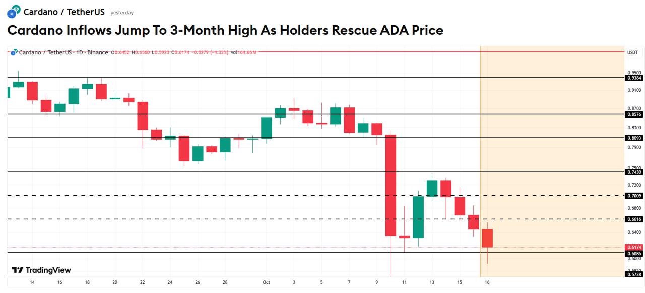 According to TradingView statistics, Cardano has lost key support levels in a few days although inflows have soared to 3 month high. Having not managed to surge past $0.74, it dropped lower than $0.70 and $0.66 and is currently trading at an approximation of $0.62. This fall was anticipated by top analyst Dan Gambardello last week when he noted that a lower-trendline rejection had affirmed the continued presence of bearish pressure.