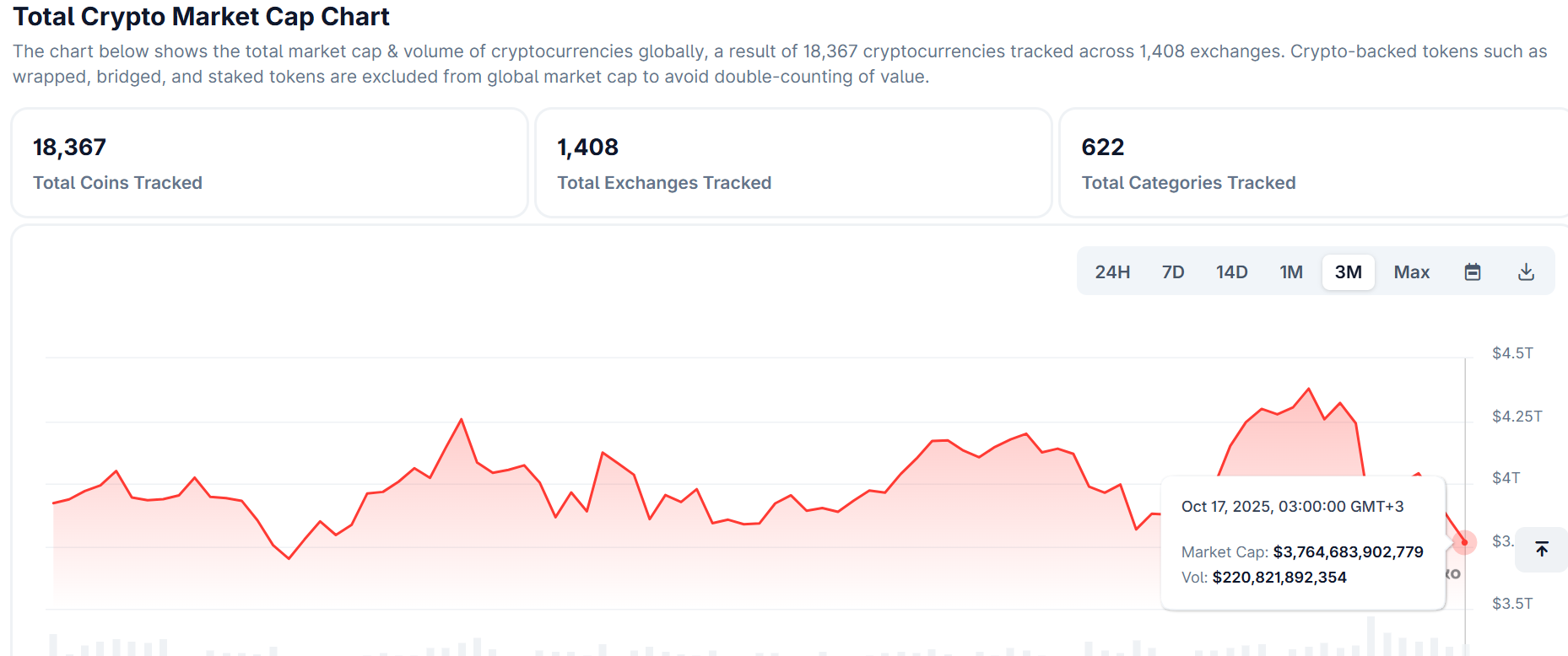 The altcoins are experiencing a big blow, including the Ethereum price, which is holding above $3,700. According to CoinGecko, the total market capitalization has fallen 6% within the last 24 hours to $3.76 trillion, after hitting a high of $4.37 trillion on Oct 7.