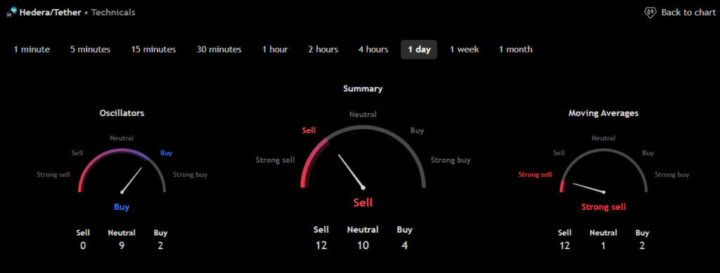 The technical analysis indicators such as Relative Volume (RVOL), Moving Average (MA), and Relative Strength Index (RSI) of Hedera (HBAR) are shown in the chart below.