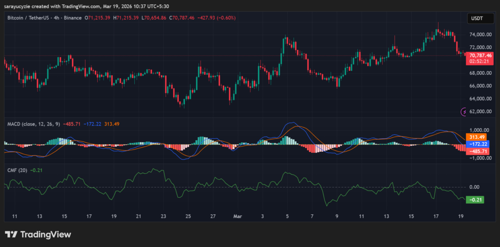 The Moving Average Convergence Divergence (MACD) line of Bitcoin is below the zero line, but the signal line is above it. This setup gives a mixed outlook. The broader trend is weak, but the recent momentum is trying to shift upward. Also, the market is in transition, not fully committed to one direction.