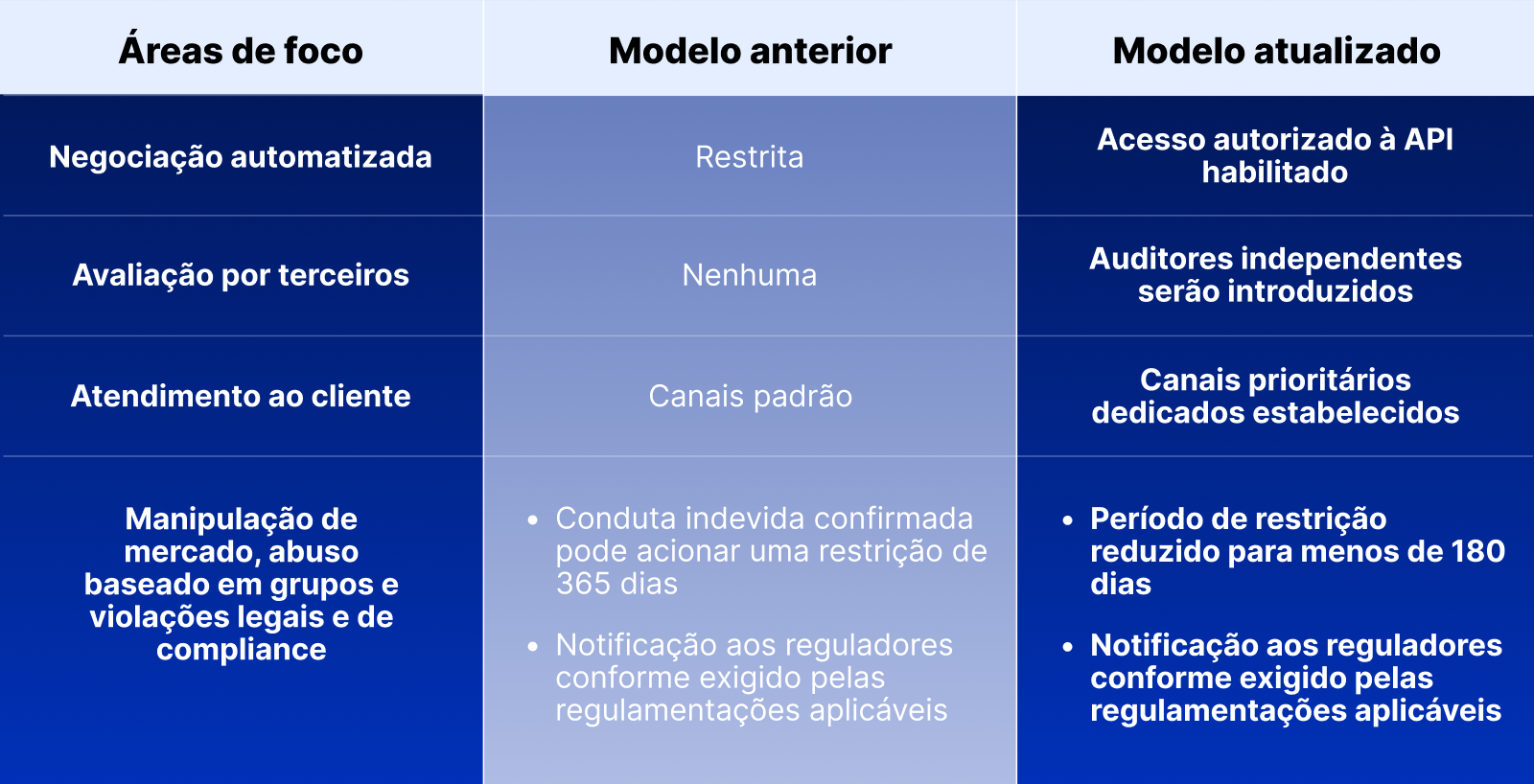 • Processos de conformidade mais previsíveis, incluindo limite de 180 dias para restrições de conta
