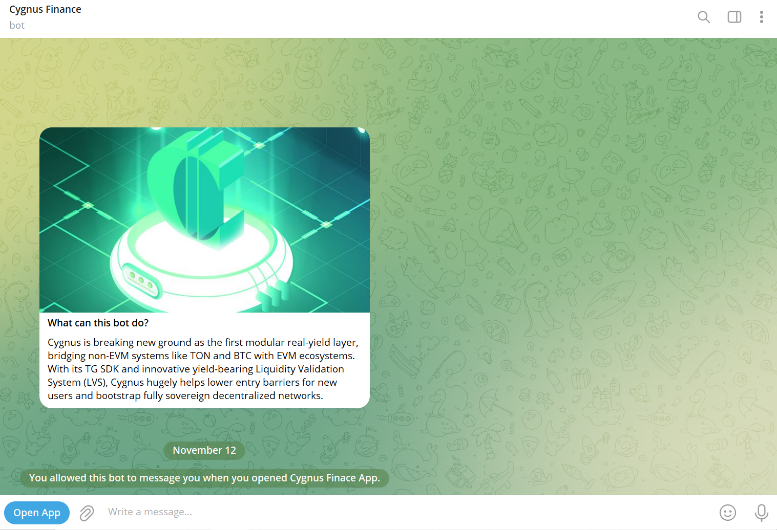 Telegram Mini App (CygnusFinance Bot) расширяет платформу за пределы Instagram, позволяя пользователям минтить cgUSD в сети Base или cgUSDT в сети TON через простые взаимодействия с ботом. Этот мультиплатформенный подход обеспечивает доступность в разных пользовательских предпочтениях и региональных рынках.
